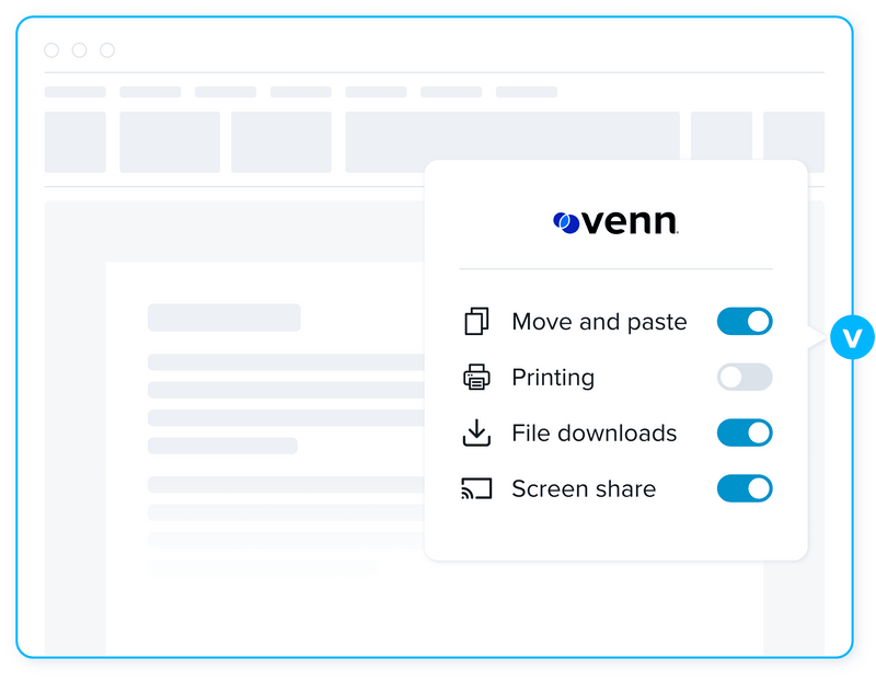 Venn’s DLP policy admin delivers complete control over how those applications and data are used including copy/paste, screen sharing, and additional controls. Comprehensive visibility and control without the learning curve.